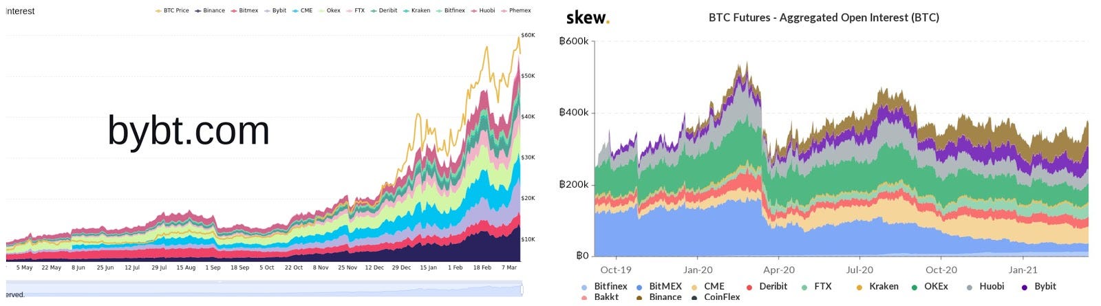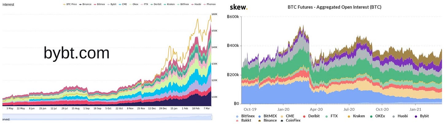 Dollar open interest broke new records with Bitcoin’s price, though an interesting chart from Skew (on the right) shows that open interest denominated in Bitcoin peaked in January. This price peak was also accompanied by a lower volume - around $150 billion a day across the leading futures exchanges.