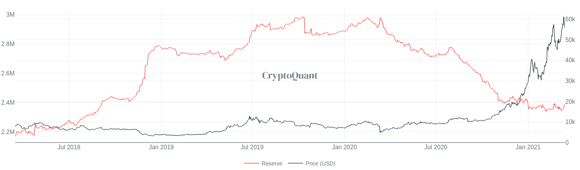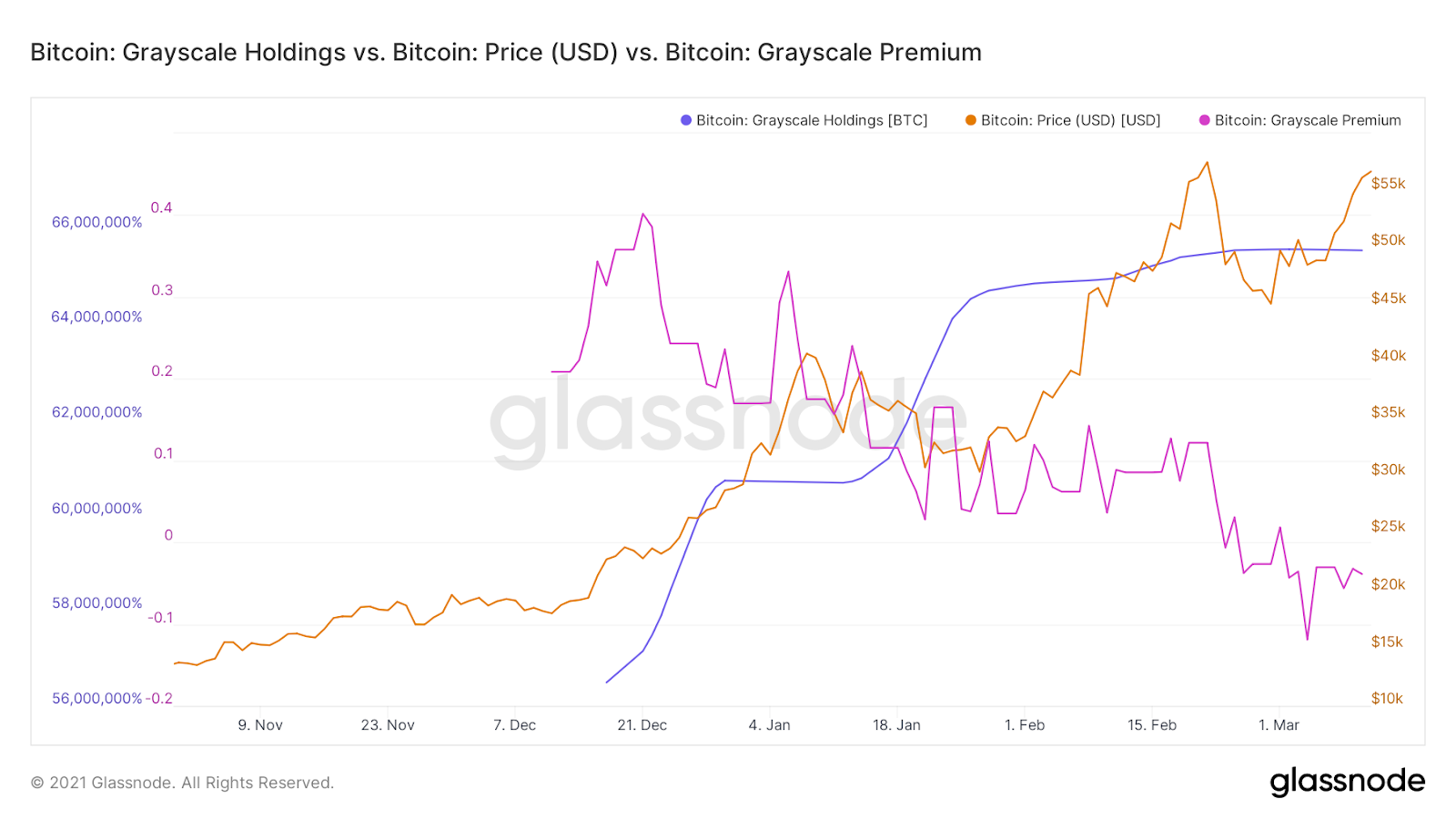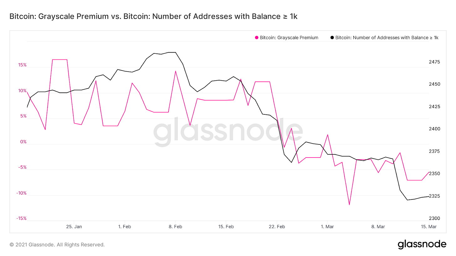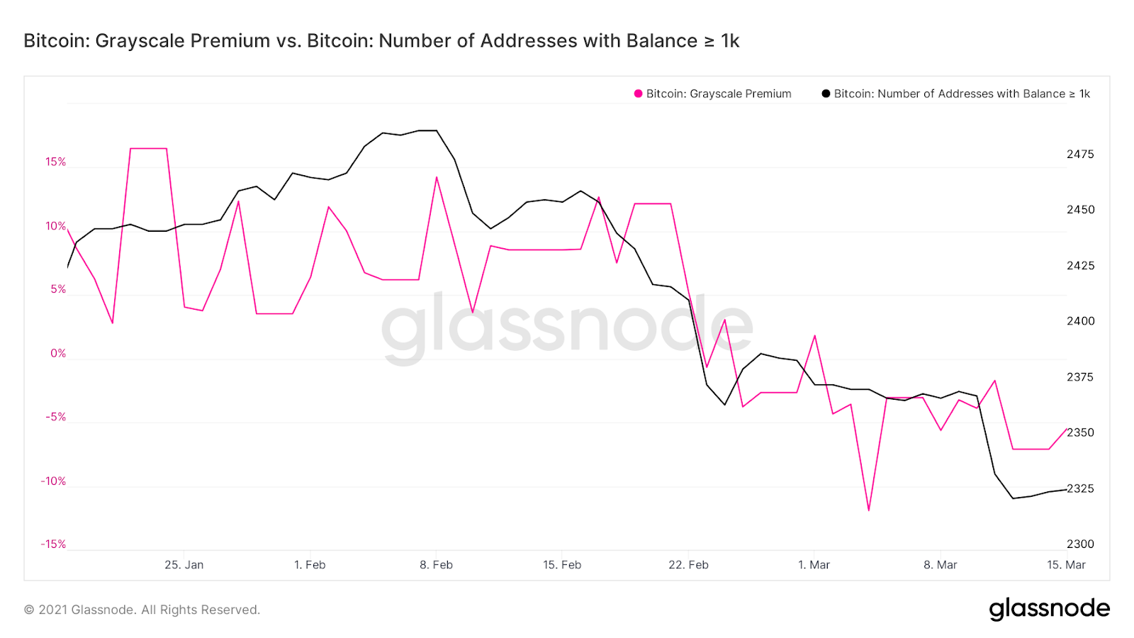 Many institutions did not choose to hold real Bitcoins, but like Altshuler Shaham, chose to invest in Bitcoin through Grayscale’s exchange traded GBTC fund or the CME futures. GBTC's unusual structure does not allow arbitrage with Bitcoin, which usually resulted in a high premium to the Bitcoin price. But in December Grayscale added to GBTC a supply of 94,000 Bitcoins (close to $500 million worth of shares) to its already large $32B billion on offer. As institutions likely hurried out of their positions, Grayscale suffered the results of this market inefficiency. GBTC reached -15% to the Bitcoin price on March 4th (and ETHE almost -10%). The Grayscale premium started its drop in tandem with the on-chain bitcoin-rich accounts, hinting that this is likely due to institutionals rushing to take profit when their initial investment doubled.