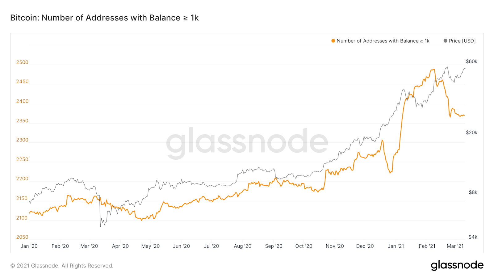 This sentiment seems to be shared by many other institutions. On-chain analytics (seen above) show “institutional size” Bitcoin addresses with over 1000 Bitcoins (currently over $56 million per-account) grew sharply since December - by 263 accounts, peaking as Bitcoin rose through $40,000 per-coin for the first time. As Bitoin price kept rising this February, the number of these bitcoin-rich accounts dropped sharply. Were these institutional investors taking profits like Altshuler?